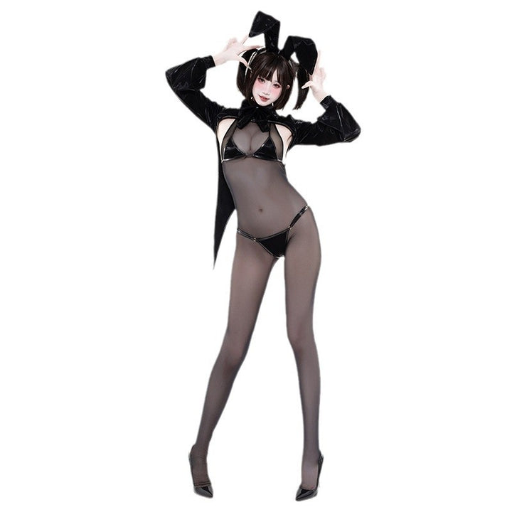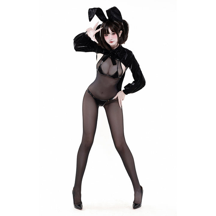 F-242 Shimmering Leather Bunny Girl Sexy Lingerie Halloween Set: Black Headband, Tuxedo-style Bodysuit